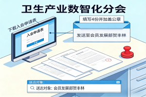 申请单位加入卫生产业数智化分会,先下载、并填写入会申请表各4份并加盖公章,发送给会员发展部贺丰林。